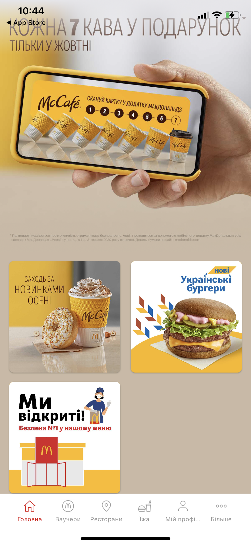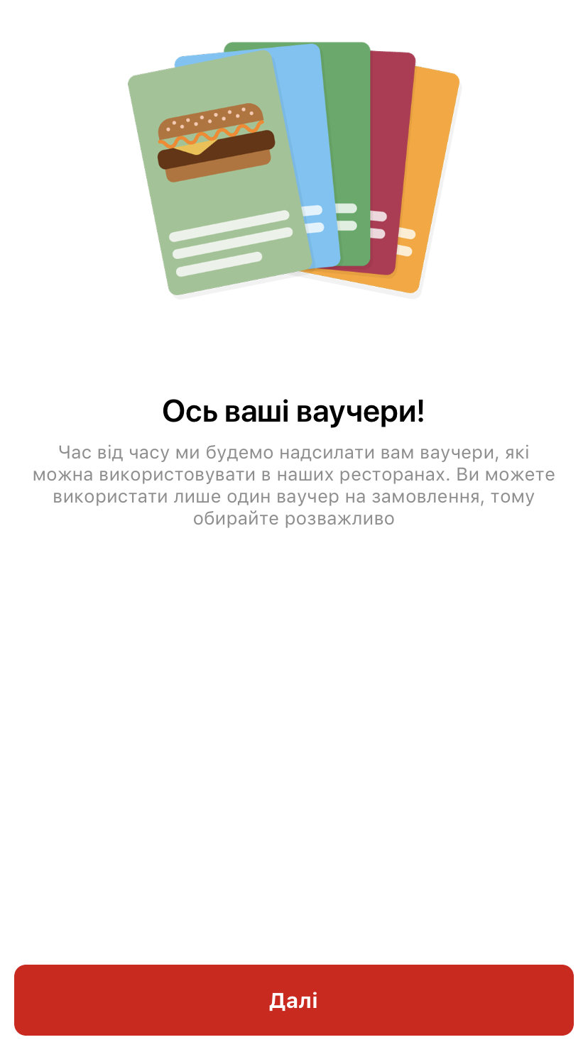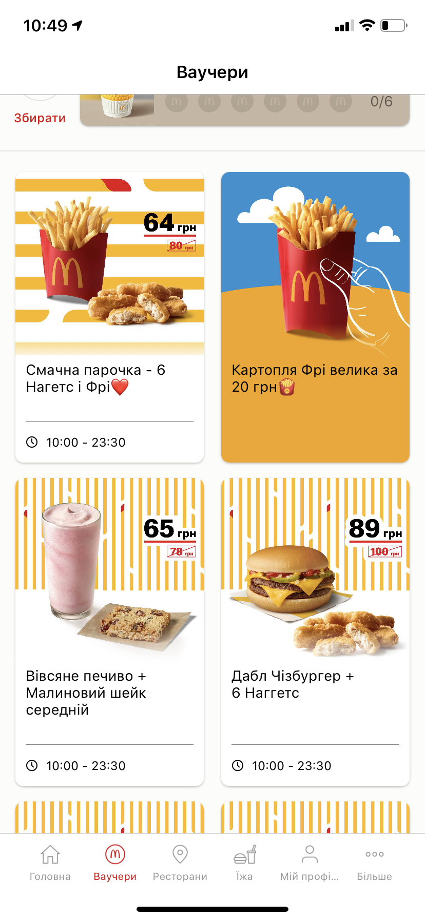 Теперь вам доступны ваучеры. Например, сегодня вы можете купить картошку фри и нагетсы за 64 гривны вместо 80. И несколько других предложений.