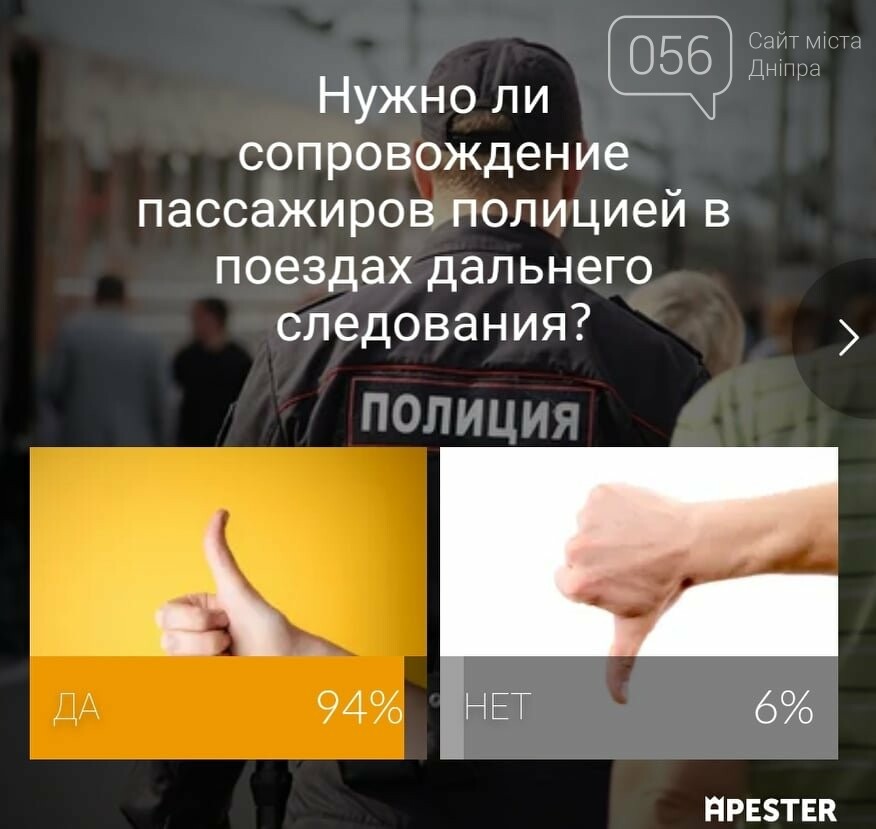 - 94 процента горожан, которые поучаствовали в опросе, уверены, что отсутствие представителей Национальной полиции в поездах — реальная проблема, поэтому обязательно нужно вернуть сопровождение пассажиров полицией.