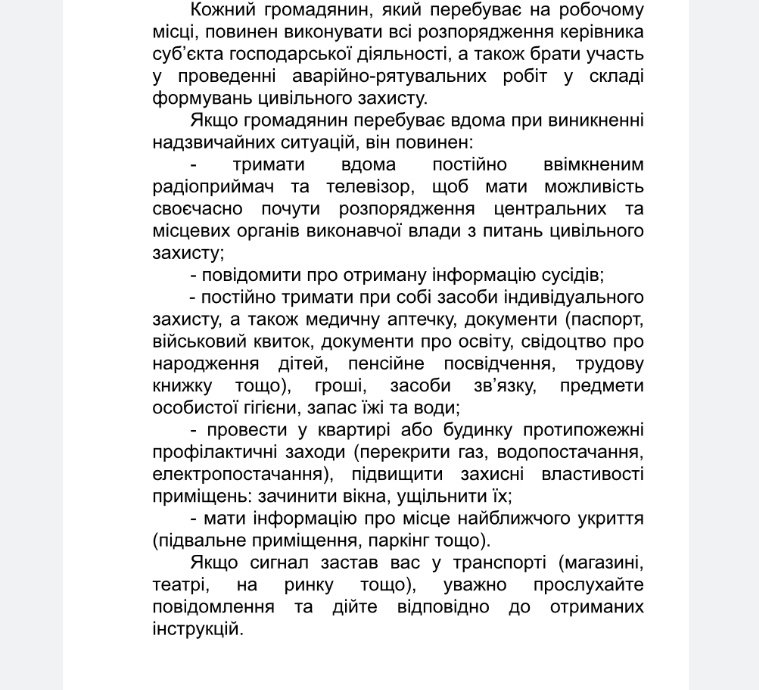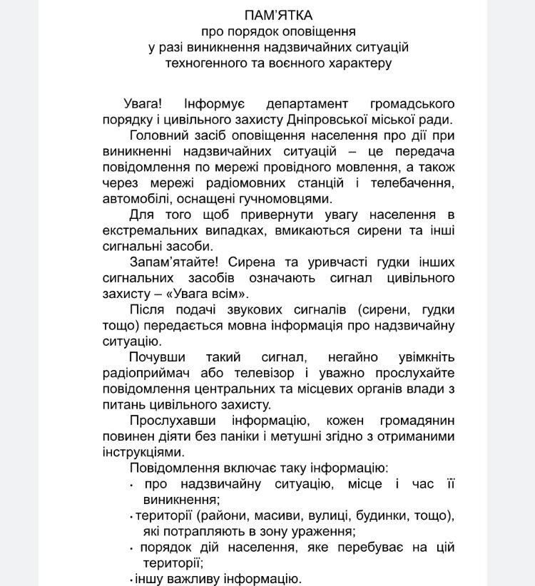 «Услышав сирену, сохраняйте спокойствие — вашей жизни и здоровью ничего не угрожает! Включите радио или телевизор, внимательно прослушайте сообщение после сигнала «Внимание всем!» и действуйте согласно полученной информации. Оповестите об этом соседей, особенно — людей пожилого возраста», — сообщают в департаменте общественного порядка и защиты.