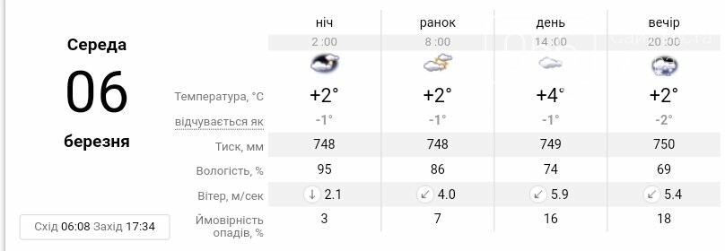 6 березня у Дніпрі хмарна погода буде триматися до самого вечора. Ввечері, можливо, пройде дрібний дощ зі снігом.