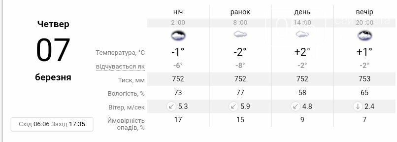 7 березня у Дніпрі протягом усього дня небо буде вкрите хмарами. Без опадів.