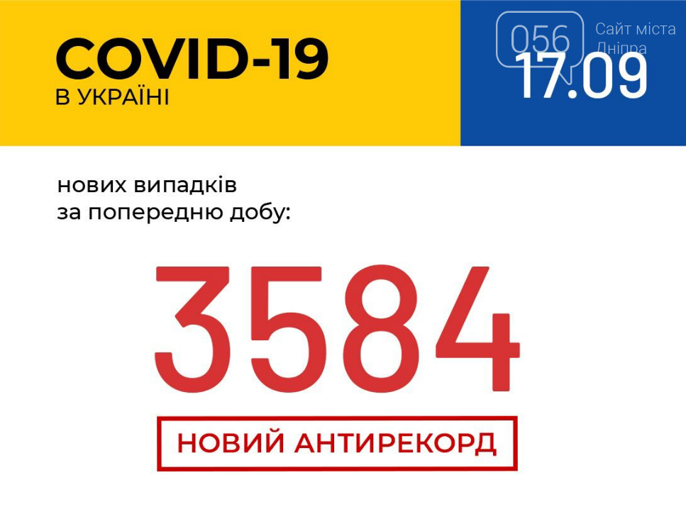 По состоянию на утро 17 сентября в Украине поставлен антирекорд по количеству зарегистрированных случаев заражения COVID-19. За сутки больных стало больше на 3584 человека. Из больниц выписаны 1589 пациентов.